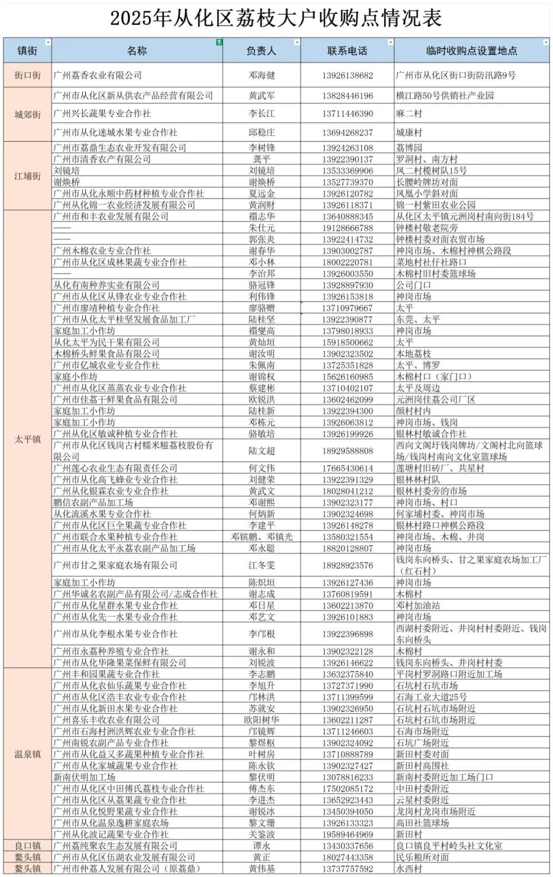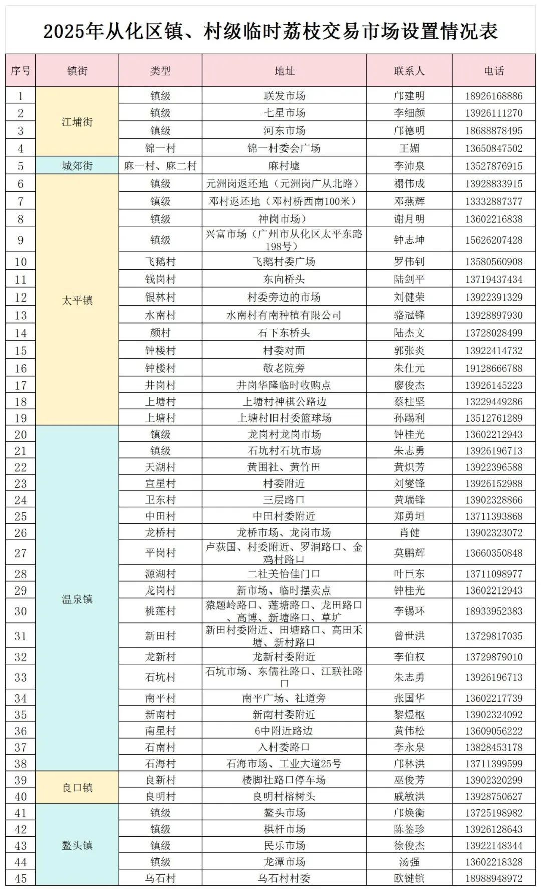 产销工作进入关键阶段。为实现“荔枝丰产、荔农增收”,从化区积极行动,全力整合产销资源,深化农产品“12221”市场营销体系建设,凝聚销售合力,助力荔农拓宽销售渠道。根据《2025年促进从化荔枝生产销售“十项措施”行动方案》要求,从化区发布全区45个镇、村级临时荔枝交易市场以及65个荔枝大户收购点,为荔农和收购主体搭建便捷高效的交易平台。